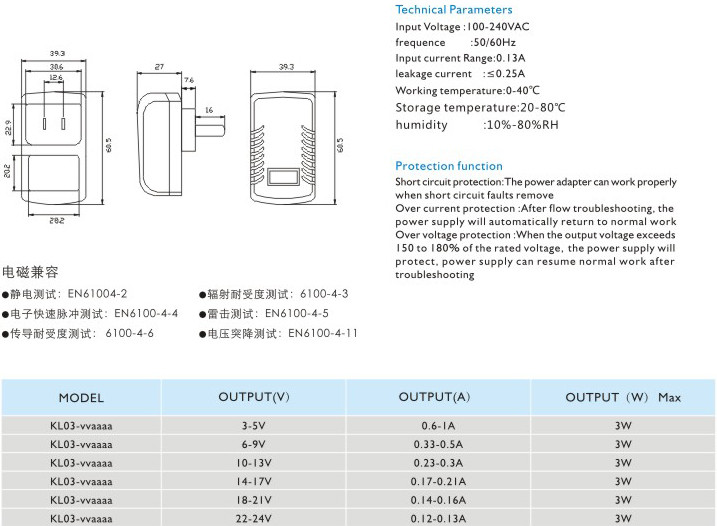 頻率:50/60Hz 輸入電流:0.13A 漏電電流:≤0.25A 工作溫度:0-40℃ 貯藏溫度:-20-80℃ 濕度:10%-80%RH 短路保護(hù): 電源適配器在短路解除時(shí)能正常工作恢復(fù) 過流保護(hù):過流故障排除后,電源將自動(dòng)恢復(fù)正常工作 過壓保護(hù):當(dāng)輸出電壓超過額定電壓的150-180%時(shí),電源將保護(hù),故障排除后電源能恢復(fù)正常工作" />